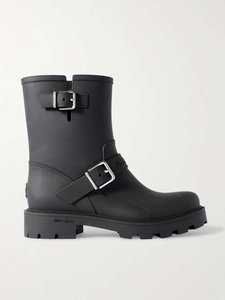 Inspired by biker styles, Jimmy Choo’s boots have been made in Italy from bio-based rubber in a chunky profile. They’re embellished with buckles and have thick lug soles for lift and grip.