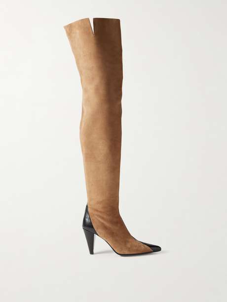 KHAITE's 'Harvey' over-the-knee boots are a standout pair among the brand's Spring '26 collection. Made in Italy from tan suede and black leather, they look like two different styles depending on the angle. They have conical heels that mirror the sharply pointed toes and notched cuffs for comfort.
