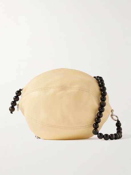 LEMAIRE's playful clutch is made from individually stitched panels of smooth leather in a round 'Balloon' shape. It's adorned with a beaded obsidian shoulder strap and is sized to hold your phone, wallet and lipstick.