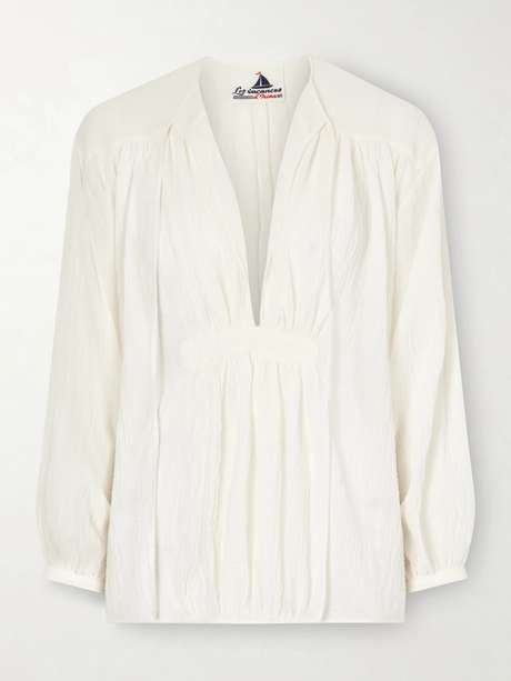 Les Vacances d'Irina's 'Hazy Nipple' shirt draws inspiration from Romanian style with a fluid shape, gathers at the front and long balloon sleeves creating soft pleats and movement. Made from pure cotton in a neutral ivory hue, it features a self-tie V-neckline.