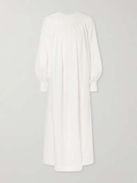Les Vacances d'Irina's 'Robe de Nuit' maxi dress references neo-classic sleepwear. Made from lightweight linen, it has a gathered neckline with raglan balloon long sleeves finished with wide cuffs. It self-ties at the nape, leaving the back partially bare, and falls to an ankle-length, fluid silhouette.