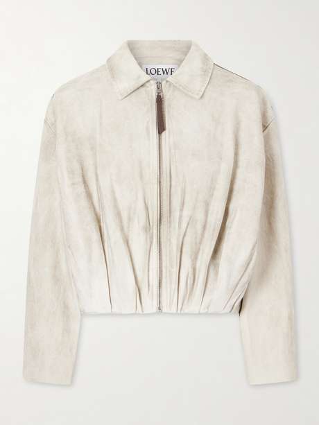 Designed to echo the draped details of Loewe's latest bags, this bomber jacket is hand-gathered into loose folds and pinned with a logo-embossed leather patch at the back. It's cut from washed cotton-twill in a subtly cropped, regular fit with dropped shoulders. The leather zip pull nods to the house's legacy.