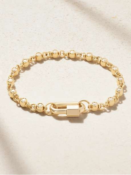 Marla Aaron's bracelet is a fresh, modern spin on classic tennis styles. Handcrafted from 18-karat gold, it's interspersed with 'can'-shaped charms that move softly, reflecting the light-catching diamonds at each end. This version features the label's signature carabiner-inspired 'Babylock', but you can add one (or two) of your own to customize it.