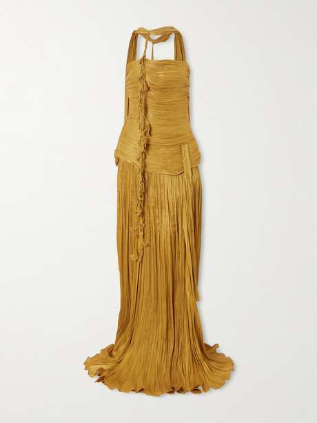 Marmar Halim's gown is made from plissé-satin, so every movement is like poetry. It has a strapless, fitted bodice and a thin scarf that gracefully sweeps around your neck so you can forgo jewelry. Slip on your favorite pumps and dazzling ruby or emerald earrings.