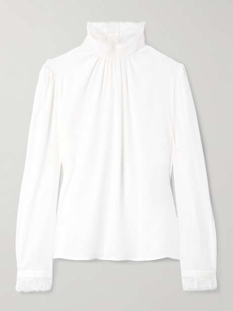 McQueen's blouse is made from lightweight silk crepe de chine that drapes beautifully. It's trimmed with delicate lace along the high neckline and buttoned cuffs for a romantic touch. The gentle gathers enhance the slightly loose shape.