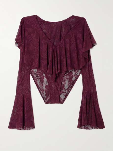 Norma Kamali's bodysuit recalls vintage styles with its romantic drape. Made from stretch-lace, it has a ruffled plunging neckline and bell cuffs. It fits like a glove thanks to the snap-fastening base.