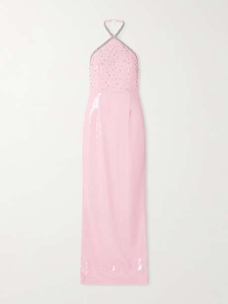 Rebecca Vallance's 'Lydia' gown is saturated with tonal-pink sequins that create a light-catching, shimmering effect. It has boning at the fitted bodice, crystals along the halter neckline and a long column skirt with a back split for easy movement.