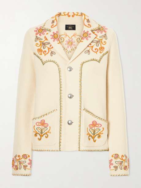RRL offsets its signature Western codes through a softer lens with the 'Bella' cardigan. Knitted from a cotton and cashmere blend, it’s crocheted with floral motifs and contrast blanket stitches that trace the seams and pockets.