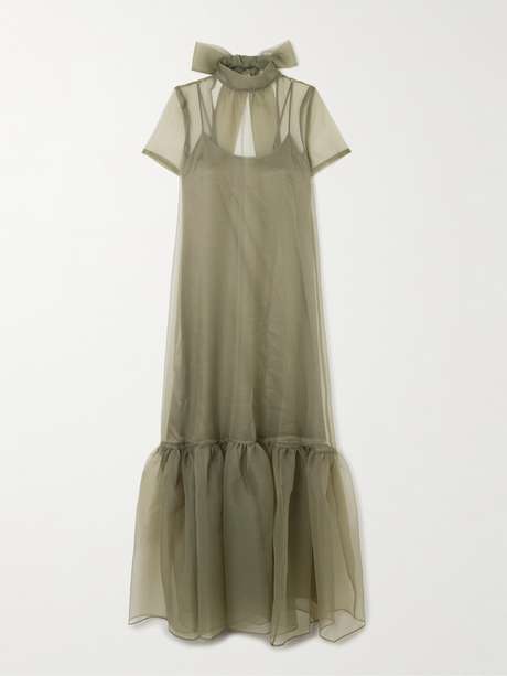STAUD's 'Calluna' maxi dress falls to a voluminous ruffled hem. It's made from sheer organza that's lined with a tonal slip and has a high neckline with oversized ties at the back that fasten into a sweet bow. Lean into the glamour and wear yours with sparkling drop earrings.
