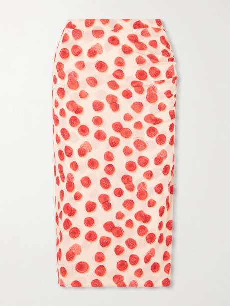 Stella McCartney’s midi skirt will bring a playful note to your warm-weather rotation. Scattered with raspberry motifs, it’s cut from mesh and softly gathered through the waist to define its streamlined shape.