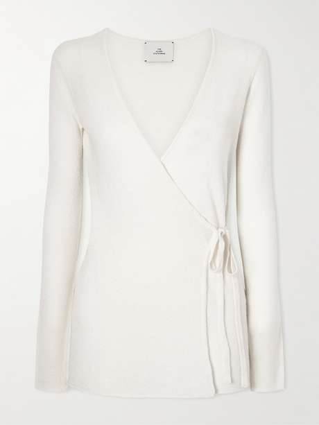 The Elder Statesman’s ‘Pebble Beth’ cardigan is defined by its softly textured finish. Spun from a cashmere and silk-blend, it wraps across the frame with a self-tie closure and has a relaxed, gently structured shape.