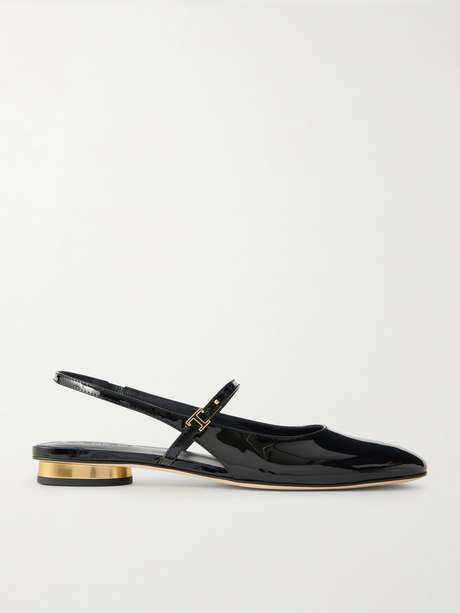 Tod's Mary Jane flats have a glinting initialed buckle and coordinating gold-tone heel. They've been crafted in Italy from glossy patent-leather with timeless round toes and elasticated slingback straps.