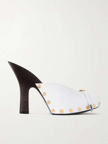 Versace’s “Sassi” clogs reimagine a classic silhouette with signature edge. Crafted from glossy patent leather, they’re studded and set on a sculpted wooden platform. A single buckle strap, tipped with a metal end cap engraved with the house’s logo, secures the fit.