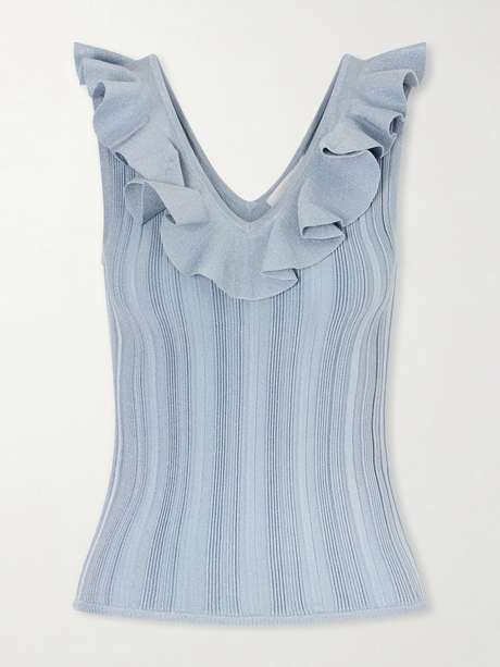 Zimmermann's 'Aster' top captures the label's romantic sensibility. Knitted in an intricate ribbed pattern shot through with metallic threads, it's shaped for a close fit topped with a frilled V-neckline.