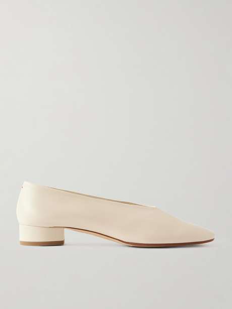 ‘90s minimalism inspires Aeyde’s ‘Delia’ pumps. Handcrafted in Italy from leather, they have high vamps with elongated square toes and rest on low block heels. Style yours with a matching white tote.