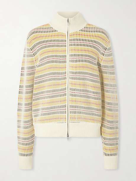 Known for elevating everyday staples with thoughtful textures, Aimé Leon Dore brings a graphic touch to knitwear. This zip-up sweater is knitted with an open, multicolored pattern that creates an airy effect. Framed with a stand collar, ribbed trims and a two-way zipper, it’s cut in a relaxed silhouette.