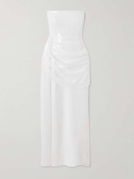The fitted, strapless profile of Alex Perry's dress commands attention. Designed with a corsetry-inspired bodice and draped skirt, it's cut from airy tulle and saturated with light-catching sequins. It's an elegant choice for modern brides who intend to make a statement – even if that's just for evening celebrations.