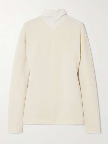 Carven's blouse is defined by the fringed silk scarf, which you can knot around your neck or leave to drape elegantly down the back. It's made from a soft wool-blend and has a loose shape with dropped shoulder seams.