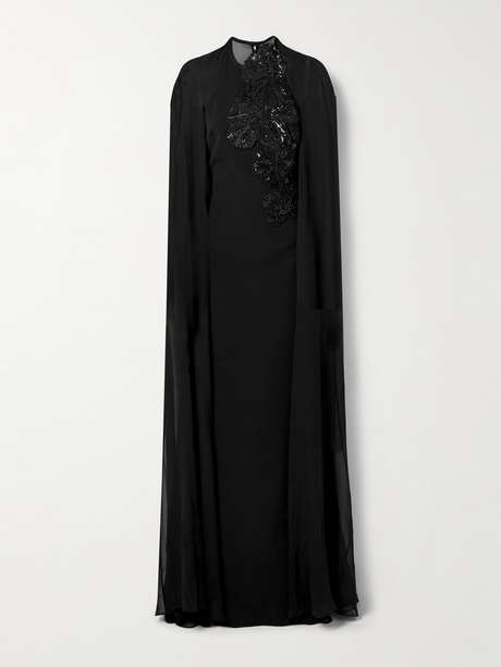 From the silk-chiffon cape to the intricate embellishment, there's so much to admire about Elie Saab's gown. Cut from black silk-crepe, it's threaded with scores of beads and sequins arranged to depict tropical flowers. The crepe de chine lining ensures comfort and coverage.