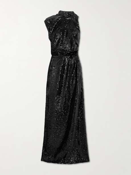 Emilia Wickstead's 'Conlan' dress sparkled beautifully as the model walked the Fall '25 runway. Made from crepe covered in scores of sequins, it has an asymmetric draped bodice that reveals a flash of skin at the back and falls to a sleek column skirt. Wear yours with all-black accessories.