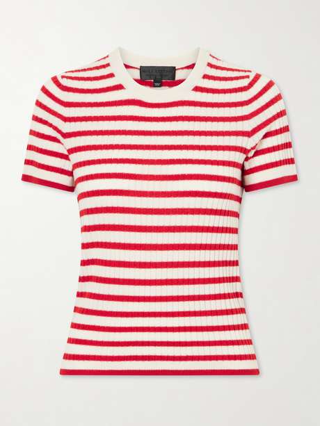 Nili Lotan's 'Alita' T-shirt is made from soft cashmere in a striped ribbed-knit pattern. It has a close fit with short sleeves and a tubular neck trim. Pair it with a skirt or jeans for a laid-back feel.