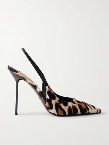 Paris Texas' 'Lidia' pumps are crafted from tactile calf hair patterned with leopard spots – the print is bold yet endlessly versatile. They have elegant pointed toes and rest on stiletto heels that offer 105mm of towering lift. The elasticated slingback straps ensure a secure fit.