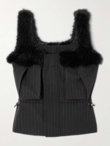 Sacai's striped top blends elements of cool utilitarian style with glamorous touches. Blended with plenty of wool, it has toggles to cinch the waist and is traced with plush material along the neckline.