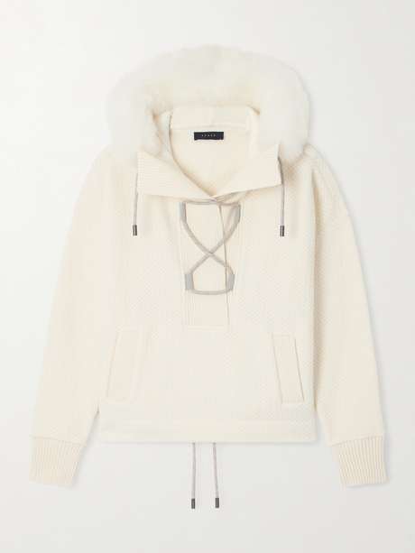 Sease’s hoodie is elevated with a plush shearling trim that frames the face and adds warmth. It’s knitted from premium wool, carefully sourced in Italy for its softness and quality.