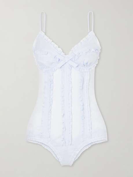 SHUSHU/TONG evokes romance and femininity in its designs. This bodysuit is made from breathable linen in a skim-fit with accentuated cups and a sweetheart neckline. Small ruffles run along the bodice and trim the edges.