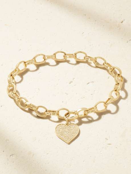 Sydney Evan’s bracelet is strung with a heart pendant that's pave-set with shimmering diamonds. It's crafted from 14-karat gold and has a polished link chain.
