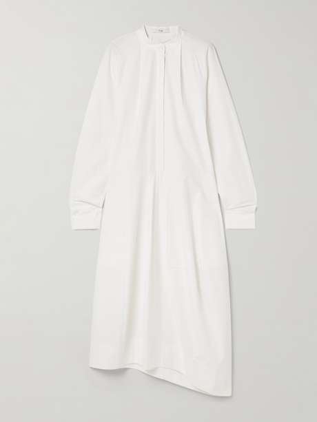 Tibi's dress is an elevated take on classic shirt styles. It's cut from crisp cotton-poplin and has streamlining pleats and a floaty, asymmetric hem. Finish the look with leather mules and a clutch.
