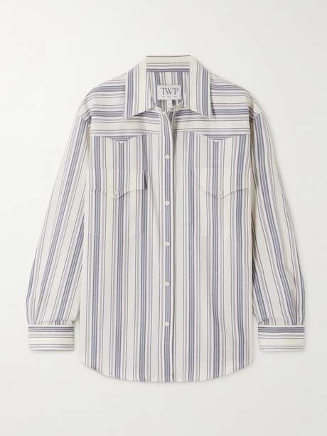 TWP's 'Dutton' shirt is designed with a pointed yoke that recalls Western styles. It's made from striped twill and has buttoned flap pockets and a relaxed fit enhanced by dropped shoulders. Wear yours with the curved hem partially tucked and roll the sleeves.