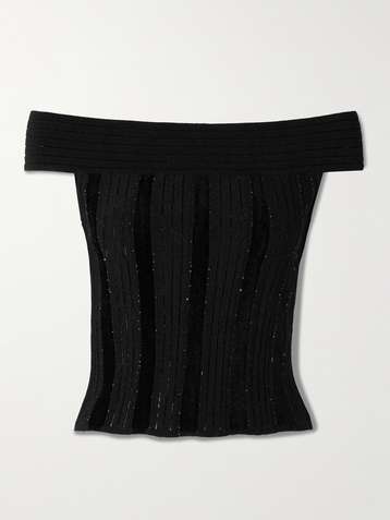 Off-the-shoulder glittered velvet and ribbed-knit top