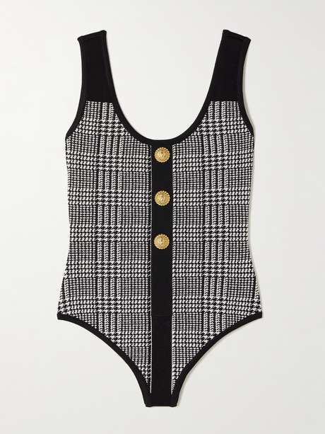Balmain's timeless bodysuit is made from stretch-knit and patterned with timeless Prince of Wales checks. It has a scooped neckline and gold-tone crest buttons along the front. Wear yours with wide-leg pants and loafers.