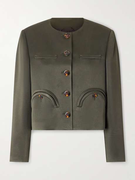 BLAZÉ Milano's 'Novalis Shamo' jacket is beautifully refined. Tailored in Italy from satin, it has a clean, collarless silhouette, the label's artfully curved welt pockets and contrasting tortoiseshell buttons.
