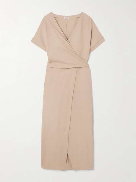 Brunello Cucinelli's dress makes a classic year-round choice. Woven with a touch of linen in the label's versatile 'Sandstorm' shade, it has a wrap front and rolled cuffs. At the back, the neck is traced with Monili as a sparkling signature.