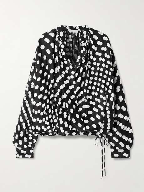 Dries Van Noten's wrap blouse captures the label's fearless approach to color and print. Cut from satin-jacquard scattered with polka-dots, it's softly gathered at the shoulders and fastens with slim ties at the waist.