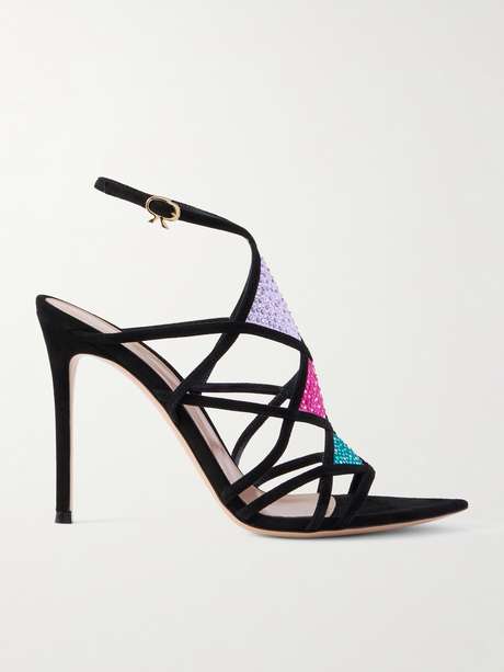 Gianvito Rossi's sandals are inspired by the beauty of stained glass windows. They're made from suede and have colorful mesh inserts adorned with shimmering crystals.