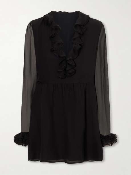 A study in contrast, this Gucci mini dress balances density and transparency through precise layering. The bodice remains compact, disrupted by a cascading ruffle that draws the eye inward, while sheer sleeves extend the silhouette into something almost dissolving at the edges.