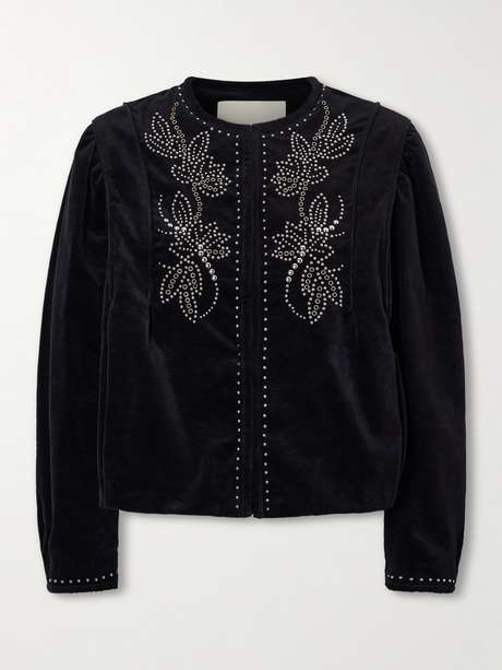 Isabel Marant's 'Pietra' jacket boasts bags of bohemian charm. It's cut from plush cotton-velvet and embellished with metallic studs, arranged in floral motifs. Take the subtly cropped cut as a styling cue, layering yours over a simple tank or T-shirt.