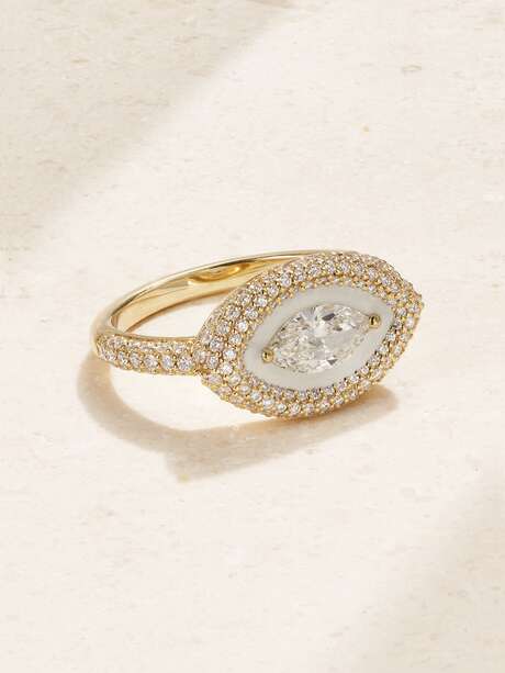KAMYEN is a family-run business backed by three generations of expertise. Cast from 18-karat gold, this ring is set with sparkling diamonds along the band and a single marquise-cut one at the center outlined in cream enamel. It's designed to resemble an evil eye - a centuries-old talisman believed to bestow protection and good fortune onto the wearer.