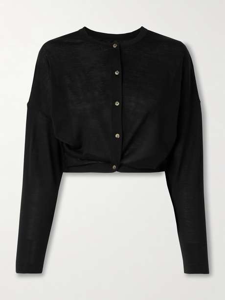 KHAITE's 'Finn' cardigan is gently gathered and cinched at the cropped waist for definition. It's made from semi-sheer merino wool and has a relaxed fit with dropped shoulder seams and horn buttons - leave the last one undone to create a curved shape.