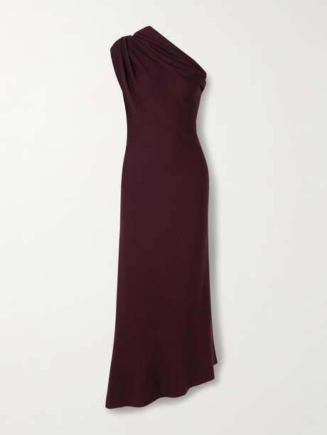 KHAITE's 'Coast' dress has a one-shoulder neckline that's beautifully gathered and draped - a recurring detail throughout the Fall '25 lineup. It's been made in Italy from a wool-blend in a burgundy hue the label calls 'Jam' and has a floaty, asymmetric hem.