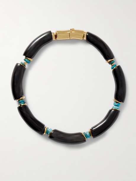 Lizzie Fortunato's founders are inspired by art, travel and slow craftsmanship. This 'Cathedral' choker is strung with tubular horn and flat turquoise beads and finished with an elongated gold-plated clasp.