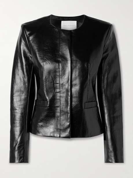 "We spend an equal amount of time and thought on the interior structure of each garment as on the exterior", says Maria McManus, whose precise design process results in clothing that looks as good as it feels. This jacket is cut from supple, glossy leather that has a lightly crinkled finish. Padded shoulders add structure, while the satin lining makes for smooth layering.