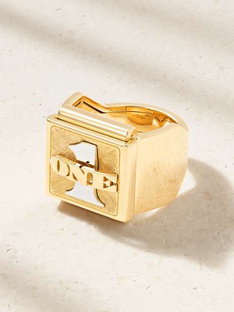 Marie Lichtenberg's 'Buck' ring is inspired by the art of shaping bank notes, known as 'Moneygami'. It's crafted from 18-karat yellow and white gold and has a chunky, folded design with number detailing at the face. It's striking enough to wear solo.