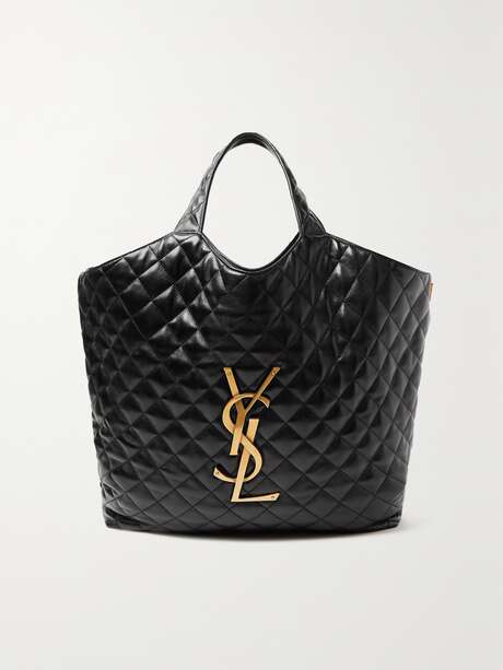 SAINT LAURENT's 'Icare' tote is crafted from black leather using the house's signature quilting technique. Capacious enough to carry everything from your tablet to cosmetics bag, this extra large iteration is perfect for travelling and even comes with an additional purse. The 'YSL' logo is set in burnished gold hardware at the front.