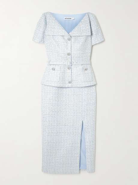 Self-Portrait's dress exudes vintage-inspired glamour. Tailored from tactile bouclé, it has a peplum bodice accentuated by a slim belt and a pencil skirt with a thigh-grazing split. Match your jewelry to the faux pearl and crystal-embellished buttons.