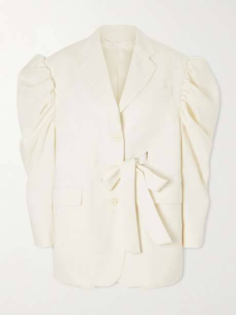 Simone Rocha's designs are always imbued with a sense of romantic rebellion. Woven with plenty of wool, this cream blazer has statement sleeves and ties that look sweet in a signature bow. Show off the open back in pictures.