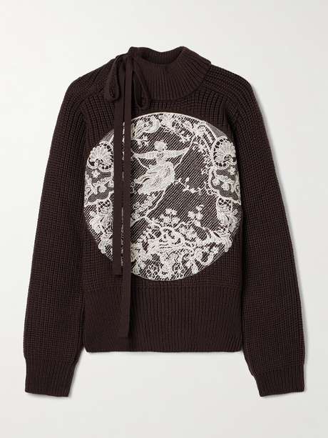 The embroidered motif on S.S. Daley's sweater is inspired by French artist Jean-Honoré Fragonard's oil painting The Swing, which dates back to the 18th century. It's rib-knitted from merino wool and has a cutout at the neck held in place by knotted ties.